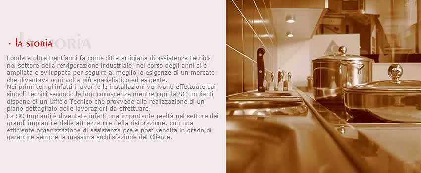 La SC Impianti č una importante realtā nel settore dei grandi impianti e delle attrezzature della ristorazione, con una efficiente organizzazione di assistenza pre e post vendita in grado di garantire sempre la massima soddisfazione del Cliente |